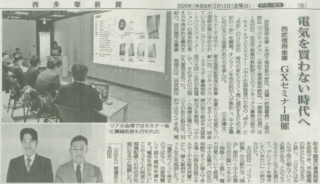 2026/2/13付の西多摩新聞のPR/総合面に、フジテックス事業共創ラボ「WAVE」にて西武信用金庫様とGXセミナーを開催したとして、掲載されました。