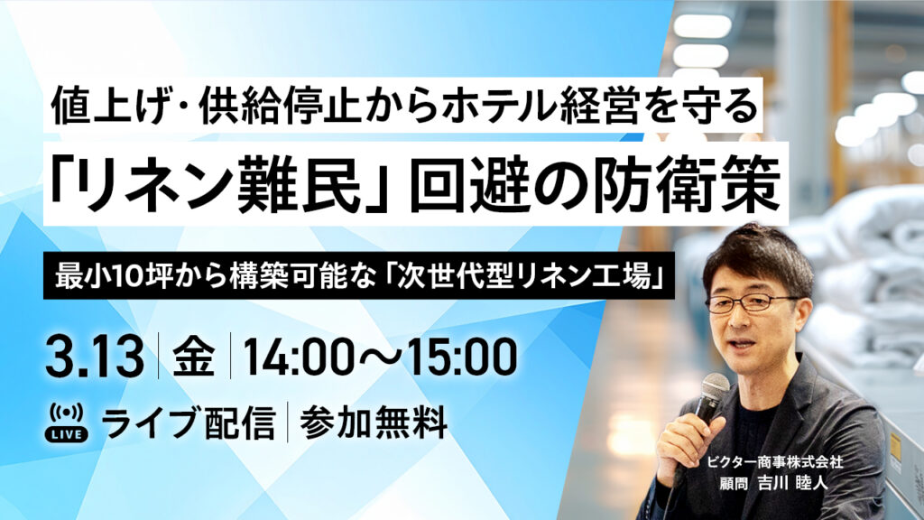 本セミナーでは、これらの外部環境に左右されず、自社でリネン供給の主導権を確保する「次世代型内製リネン工場」を公開します。
