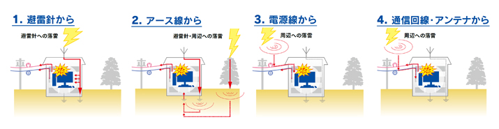この雷サージは、主に以下の4つの経路から建物内に侵入し、電子機器を破壊します。