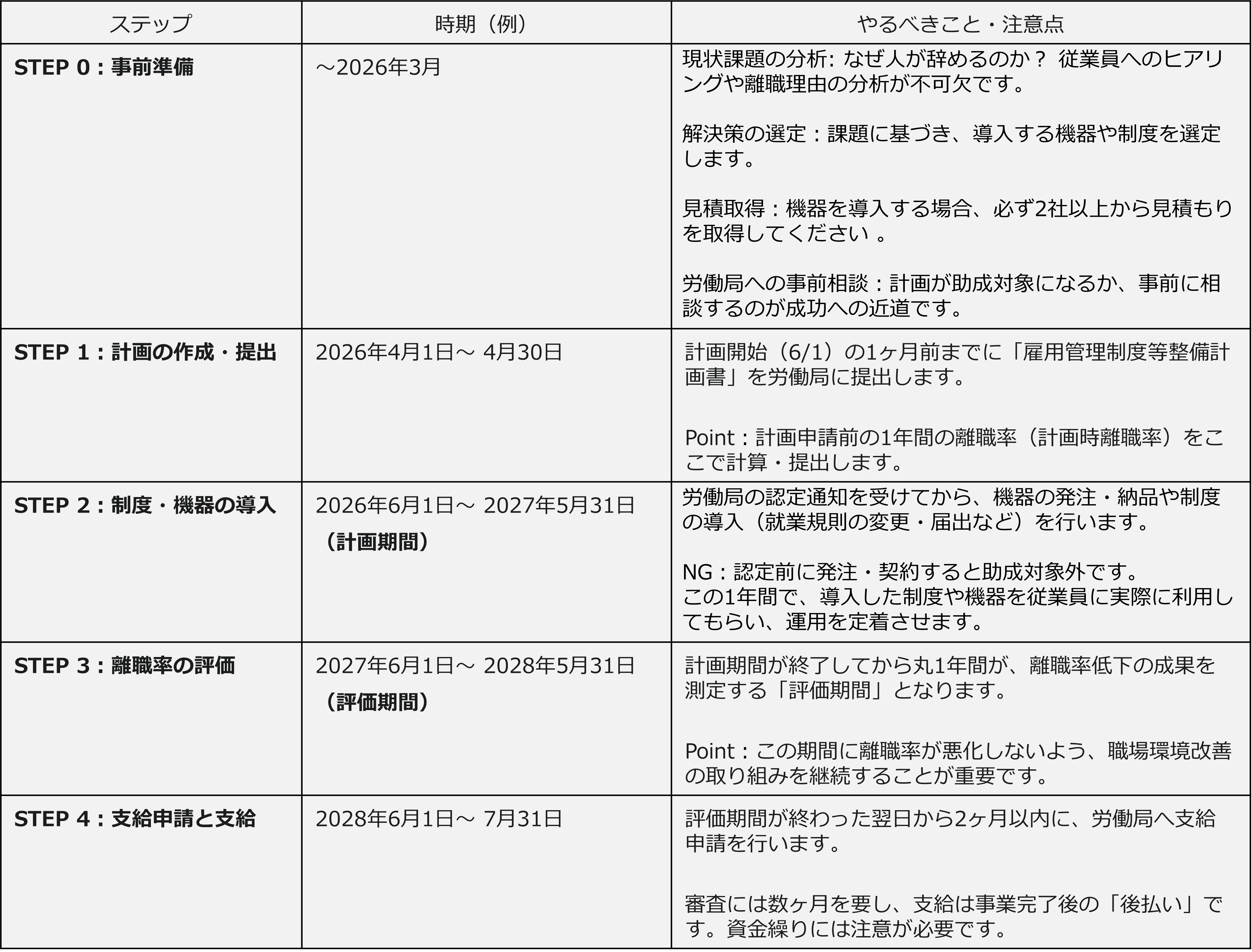 これは一見、ハードルが高く見えるかもしれません。しかし見方を変えれば、「従業員の定着」という経営課題の解決に本気で取り組む企業を、国が金銭面で強力に後押ししてくれる制度だと言えます。攻めの職場環境改善によって企業の持続的成長を目指す、まさに経営戦略ツールと呼ぶにふさわしい助成金です。