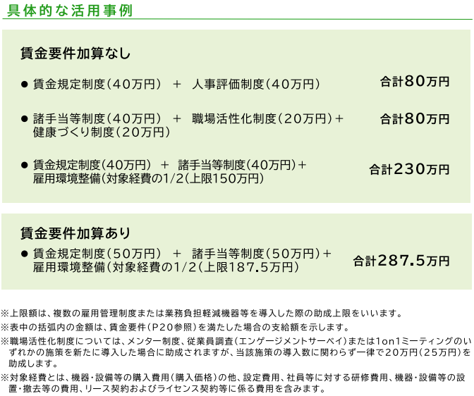 計画期間中に従業員の賃金を5%以上引き上げると、助成額および上限額が大きく引き上げられます。雇用管理制度 :上限80万円 → 100万円