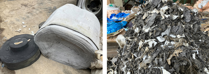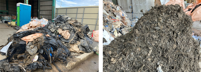 ▲耐久性フレコンの破砕前後(左:破砕前、右:破砕後)