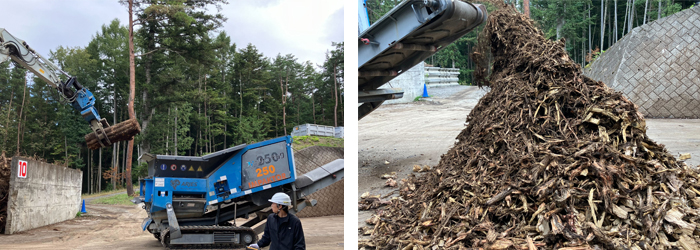2日目は山梨県の株式会社土手影建設にて破砕テストを実施しました。本会場では直径500mm程の生木やコンクリートがらの破砕テストを中心に実施しました。
