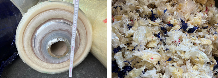 ▲粘着テープロールの破砕前後(左:破砕前、右:破砕後)