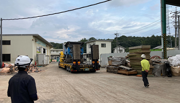 運搬は20tの低床トレーラーにて実施。車両への積み込み作業もリモコン操作で自走させることで重機等での吊り上げ作業が不要な点も、自走式破砕機ならではの強みです。