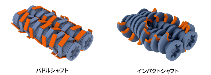 パドルシャフト:廃プラスチックや生木など、切断が必要な軟質系の処理に適しています。