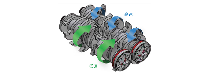 破砕軸は片軸ずつ別に油圧制御しており、それぞれの軸が負荷を検知し、低速と高速・正転と逆転を行うことにより、高い嚙み込み効率と破砕効率を実現しています。