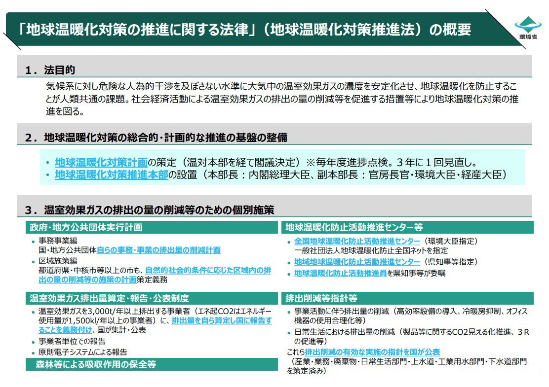 定義:一定以上の温室効果ガスを排出する事業者に対し、排出量の算定と国への報告を義務付ける法律です。