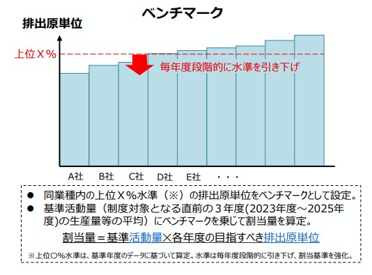 これは「業界トップランナー水準」の効率を求められる厳しい制度です。 効率の悪い設備を持つ企業は、排出枠を購入しなければなりません。