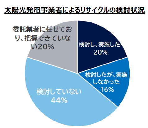 現時点での埋立処分費用が2,000円/kW程度〜であるのに対し、リサイクル費用は8,000〜12,000円/kWとなっており、差額が非常に大きい実情があります。このコスト差が影響し、太陽光発電事業者に対するアンケートでは「検討していない(44%)」「検討したが、実施しなかった(16%)」「委託業者に任せており、把握できていない(20%)」と、全体の8割の実質的な排出事業者が自らリサイクルを検討・実施していない状況が浮き彫りになっています。