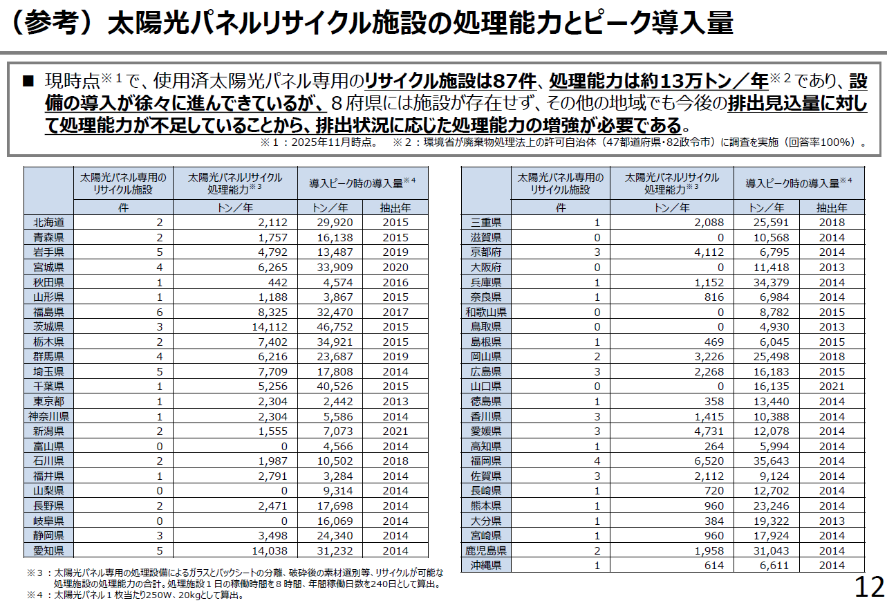 2025年11月時点の調査において、太陽光パネル専用のリサイクル施設は全国に87件、処理能力の合計は約13万トン/年となっています。
