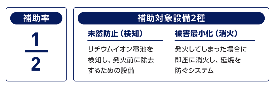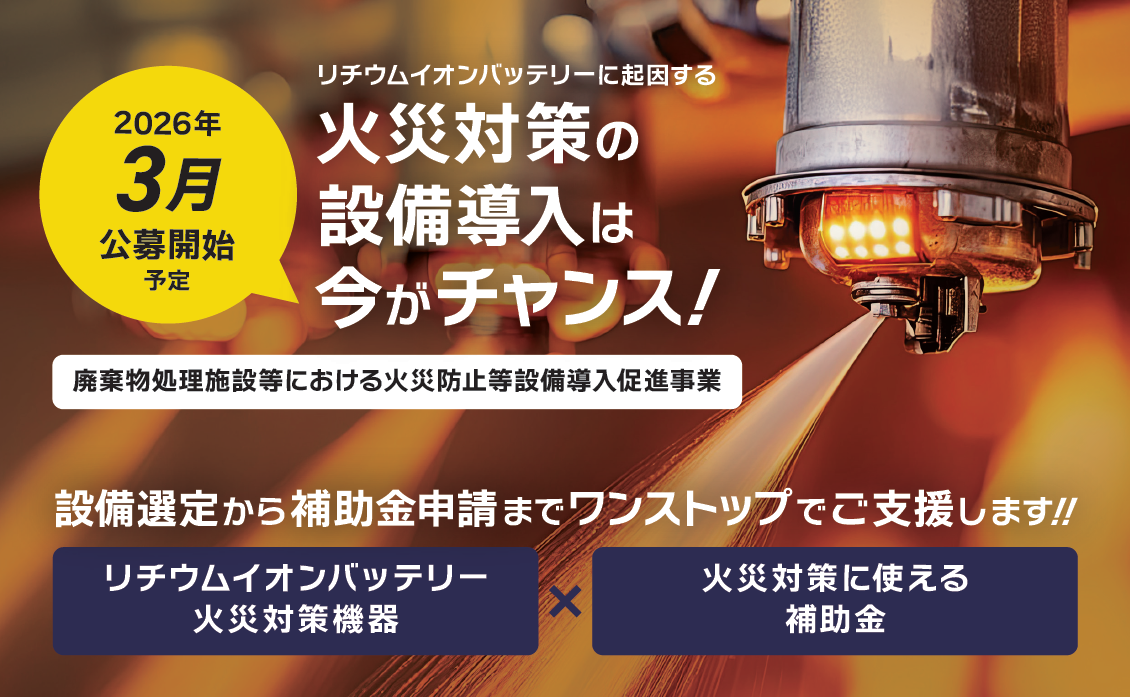 リチウムイオンバッテリーが原因の火災事故増加を受け、事態を重く見た環境省は、補正予算にて廃棄物処理施設への設備導入支援を決定しました。 この機会を活用し、低コストで安全対策を講じることが可能です。本補助金は公募期間が非常に短いことが予想されるなど、事前準備が採択のカギです! 詳しい情報をお聞きしたい方、フジテックスまでお気軽にお問合せください。